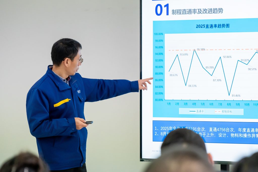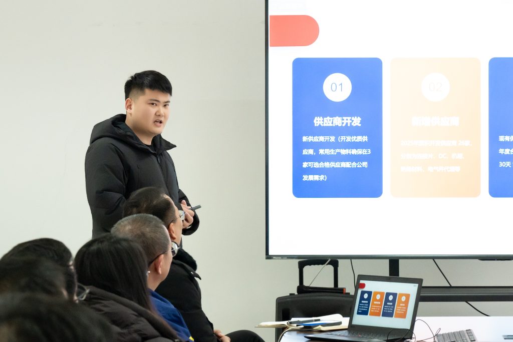 技术服务经理周帅总结汇报了小电池项目已取得的阶段性成果,通过进一步优化双面兼容测试仪等核心检测设备,持续提升产品的可靠性与客户满意度,为支撑公司新兴业务板块的快速发展提供坚实的技术保障。随后,各职能部门也围绕年度核心指标进行了系统总结。